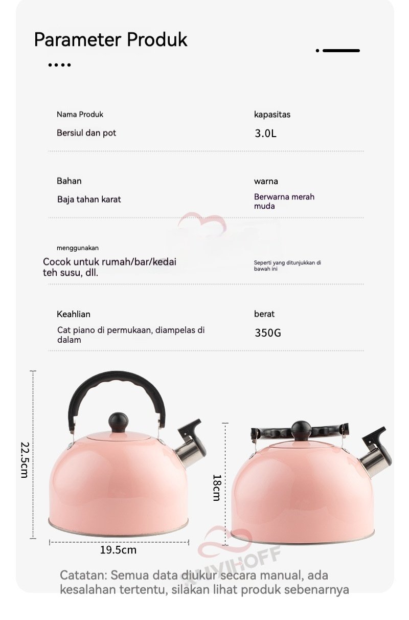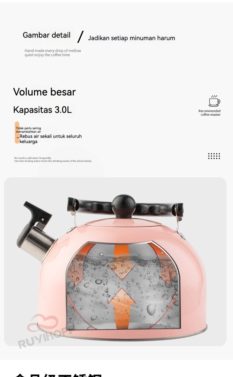 Teko / Ketel siul dari Asta Homeware berkapasitas 3 liter, cocok untuk merebus air saat ingin membuat teh, kopi, atau minuman hangat lainnya. Tersedia dalam warna pink ( merah muda ) yang cantik.