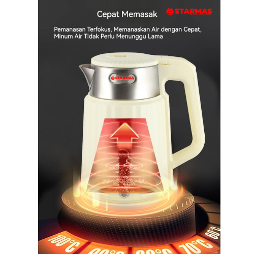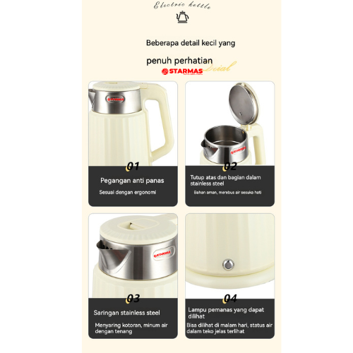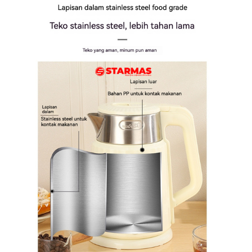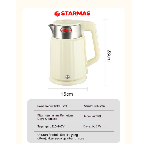 Isi Kemasan: 1 x STARMAS Electric Kettle 1,8 LITER, 1 x Plat Pemanas, 1 x Instruksi Produk.