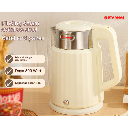 Ingin memanaskan air cepat? Cari kettle hemat listrik? STARMAS Electric Kettle 1,8 L dengan 600 Watt Low Watt memenuhi kebutuhan Anda. Dengan kapasitas 1,8 liter, kettle ini panas air cepat dan efisien. Bagian dalam terbuat dari stainless steel, tahan suhu panas dan karat. Desain elegan mempercantik dapur Anda. Tersedia 1 warna menarik: Cream